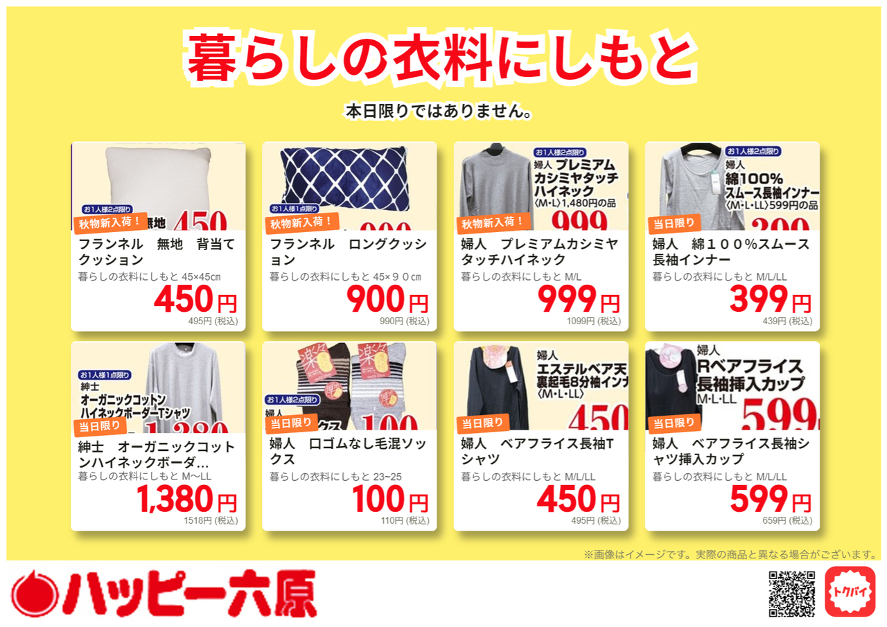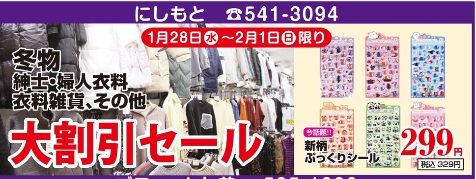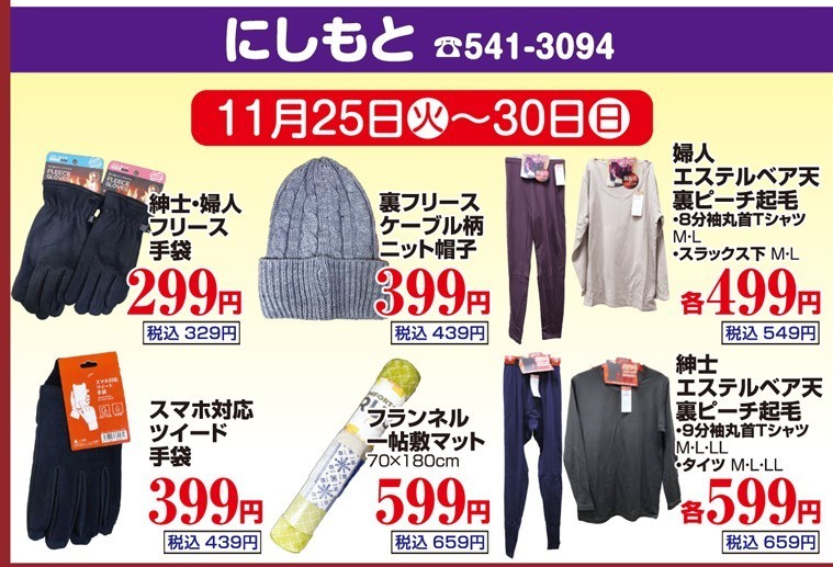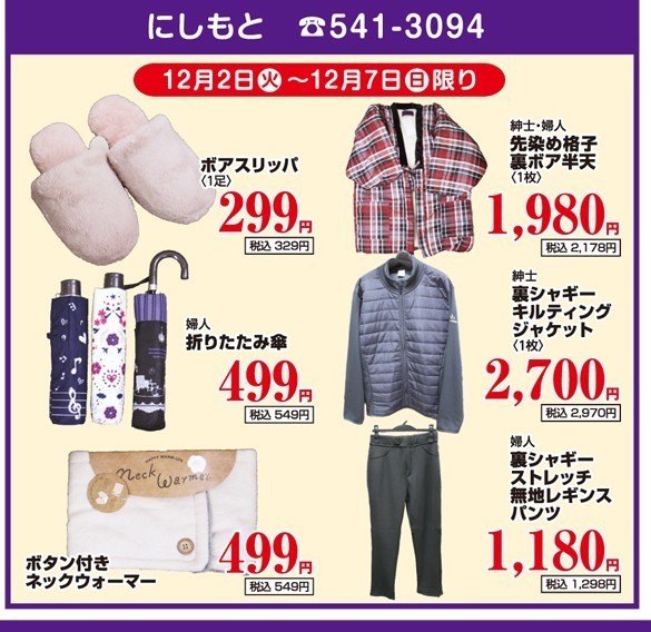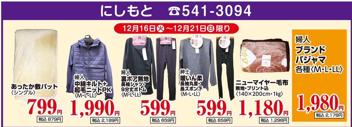 ※暮らしの衣料 にしもとです。 紳士婦人の肌着、靴下、衣料、タオル、帽子、履物など 暮らしに必要なものをいろいろ取り揃えています、何なりとお申し付けください。